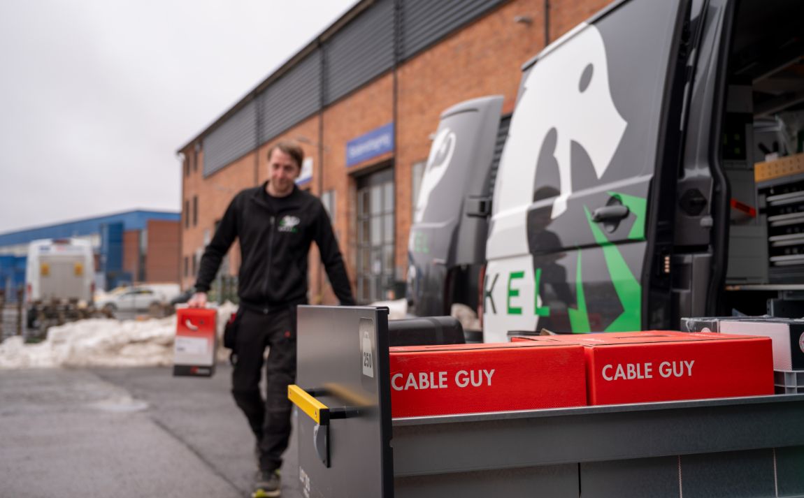 Det är min tredje firmabil på två år men nu är jag verkligen nöjd. Fyrhjulsdrift så jag alltid tar mig fram ute på landet, och lite större än tidigare så jag får plats med allt. Jag har lagt mycket tid på inredningen så att allt är lättåtkomligt och sparar tid ute hos kund. Jag är extra nöjd med dubbelgolvet där Nexans Cable Guy och FQ-lådor passar perfekt. Ibland händer det att jag till och med byter om i bilen.