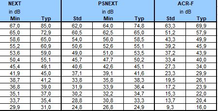 | All values are based on Worst Case 4 Connector Channel configurations according to ISO11801. Minimum and maximum values represent guaranteed Channel performance. Standard values based on ISO11801 Class EA |